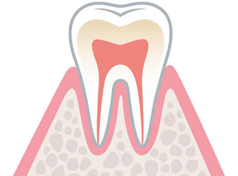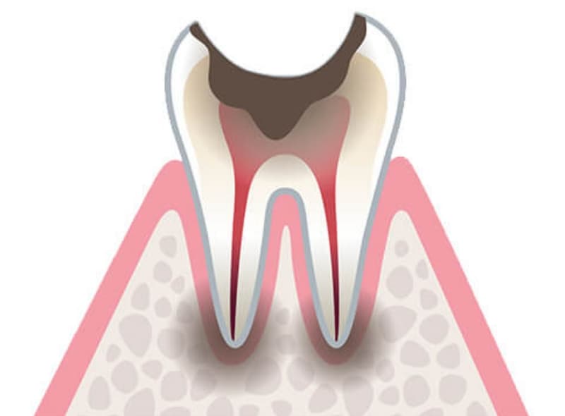 歯の神経にまで虫歯が達した状態です。虫歯がさらに進行して歯の神経まで感染してしまうと歯髄炎となり、歯がひどく痛みだします。根の先まで炎症が達すると、根の先端から外へ炎症が及び、歯肉や頬部が腫れて、膿が出る場合もあります。